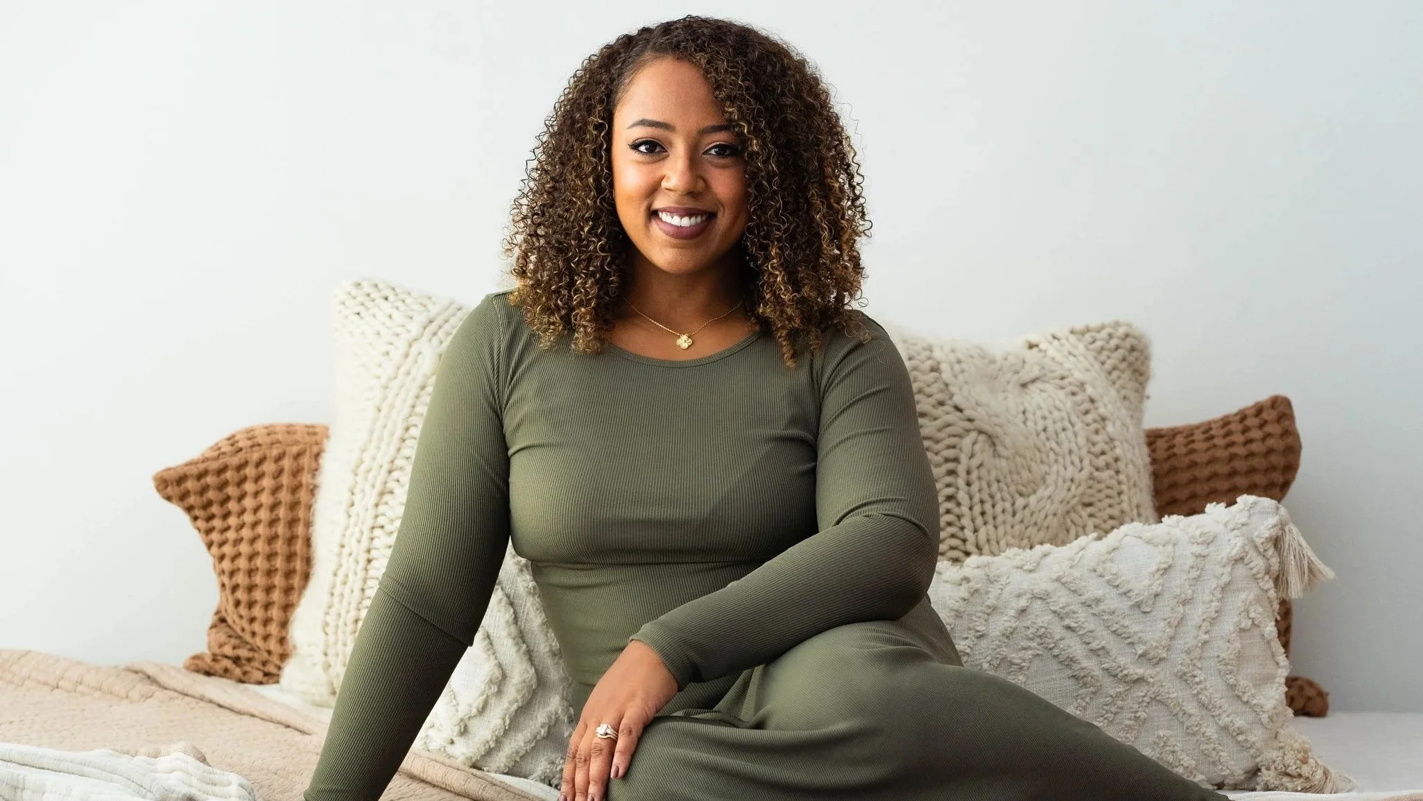 A woman with curly hair smiling and holding a cup in a kitchen with wooden cabinets and a black countertop.